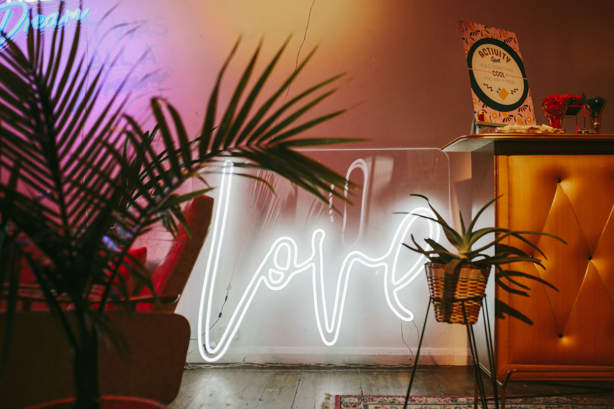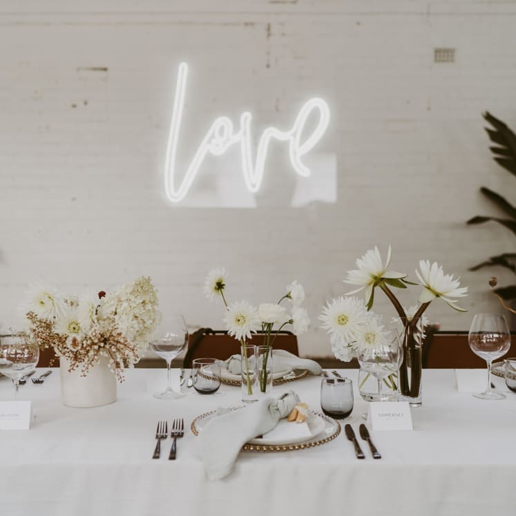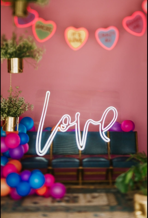 'Love' neon sign designed by Electric Confetti. This one is huge and cannot be hung up. It needs to be placed on the floor, or a sturdy shelf, on a table. Requires electricity.